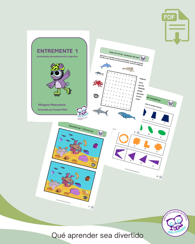 Entremente 1 es un cuaderno de actividades diseñado para estimular el desarrollo de habilidades cognitivas fundamentales a través de propuestas variadas, lúdicas y visualmente atractivas. Incluye más de 60 actividades que trabajan atención, percepción visual, memoria, razonamiento lógico, lectura inicial, motricidad fina y resolución de problemas.
