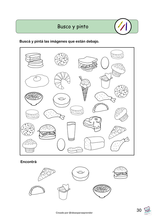 Busco y pinto, recorto y pego Para integrar motricidad fina, creatividad y comprensión de consignas.