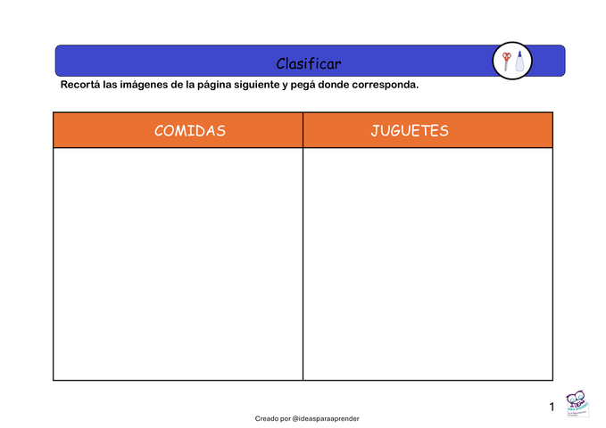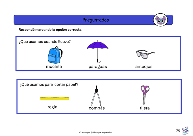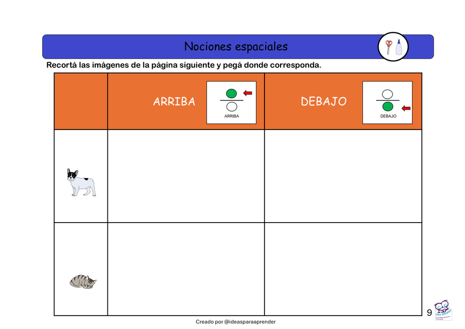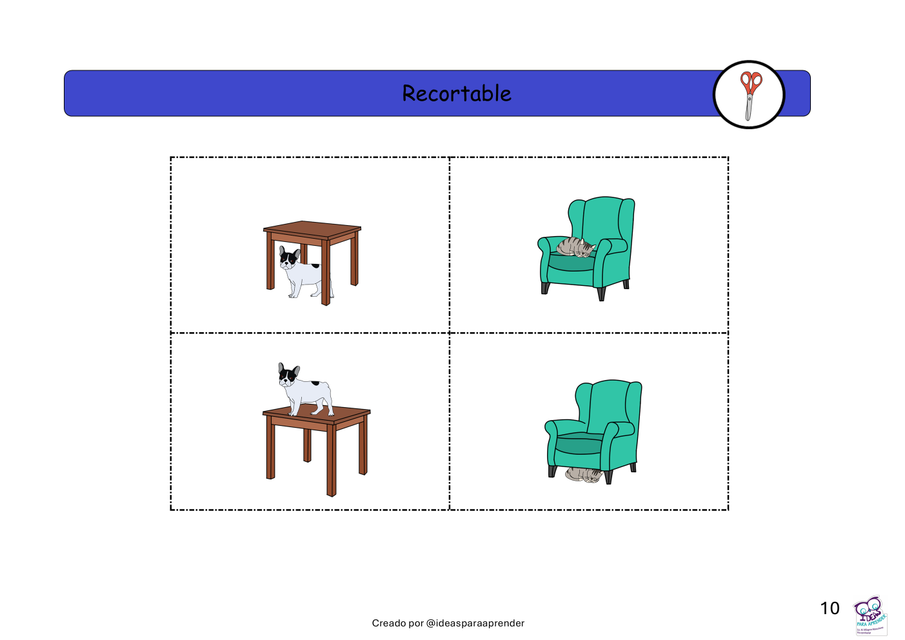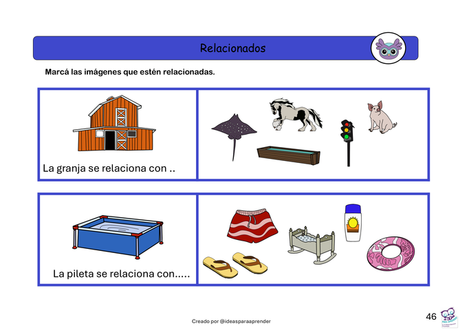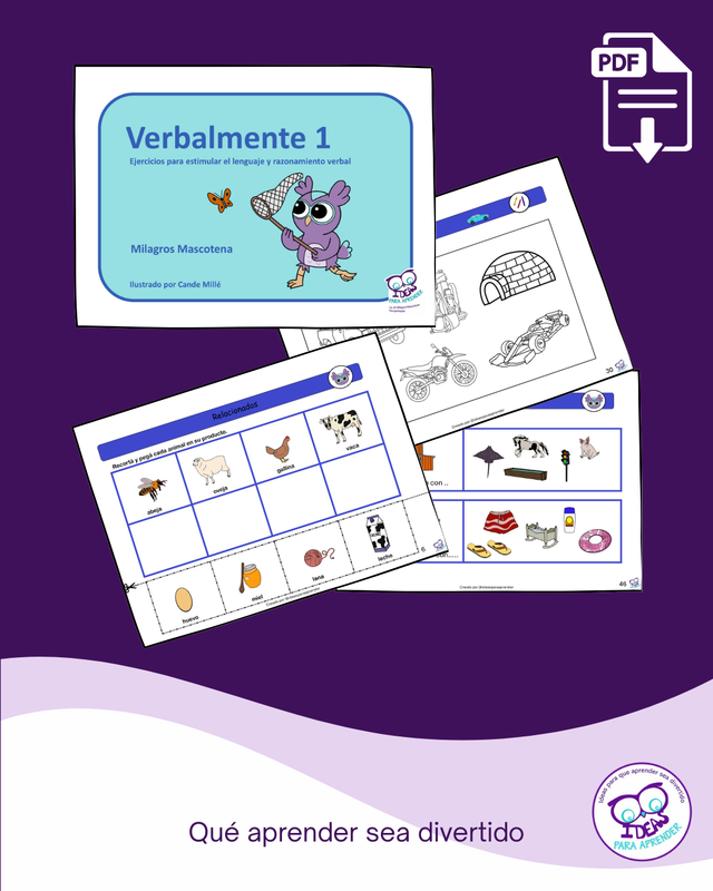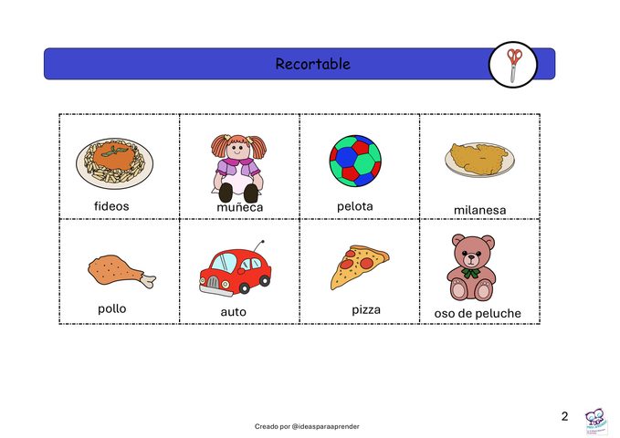 Recurso en PDF imprimible para trabajar vocabulario, categorización, nociones espaciales, pistas y analogías. Visual, claro y accesible para personas de cualquier edad que estén desarrollando habilidades de lenguaje.