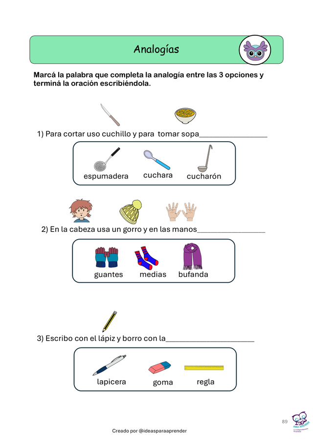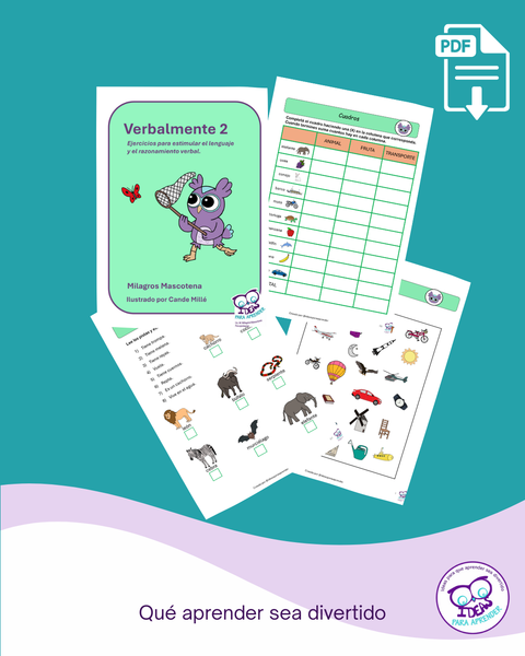 Recurso imprimible en PDF para trabajar vocabulario, categorías, pistas, intrusos, analogías y comprensión verbal. Visual, claro y accesible para personas de cualquier edad que estén desarrollando lenguaje y razonamiento