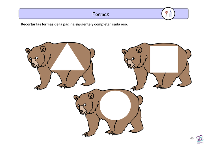 Recortar y pegar, completar figuras, identificar formas en objetos y completar escenas con formas básicas.(6 actividades)