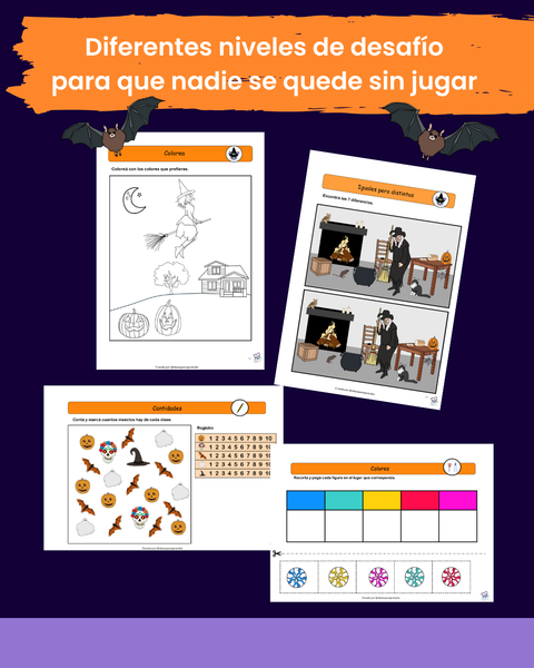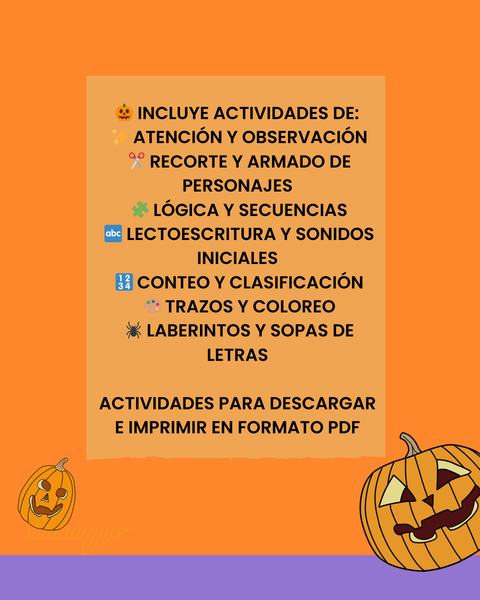 🎃 Pack Halloween: dos cuadernillos con actividades lúdicas para estimular atención, percepción, lenguaje, noción de cantidad, motricidad fina y resolución de problemas. Propuestas visuales y accesibles para aprender desde el juego en un universo temático lleno de misterio y diversión.